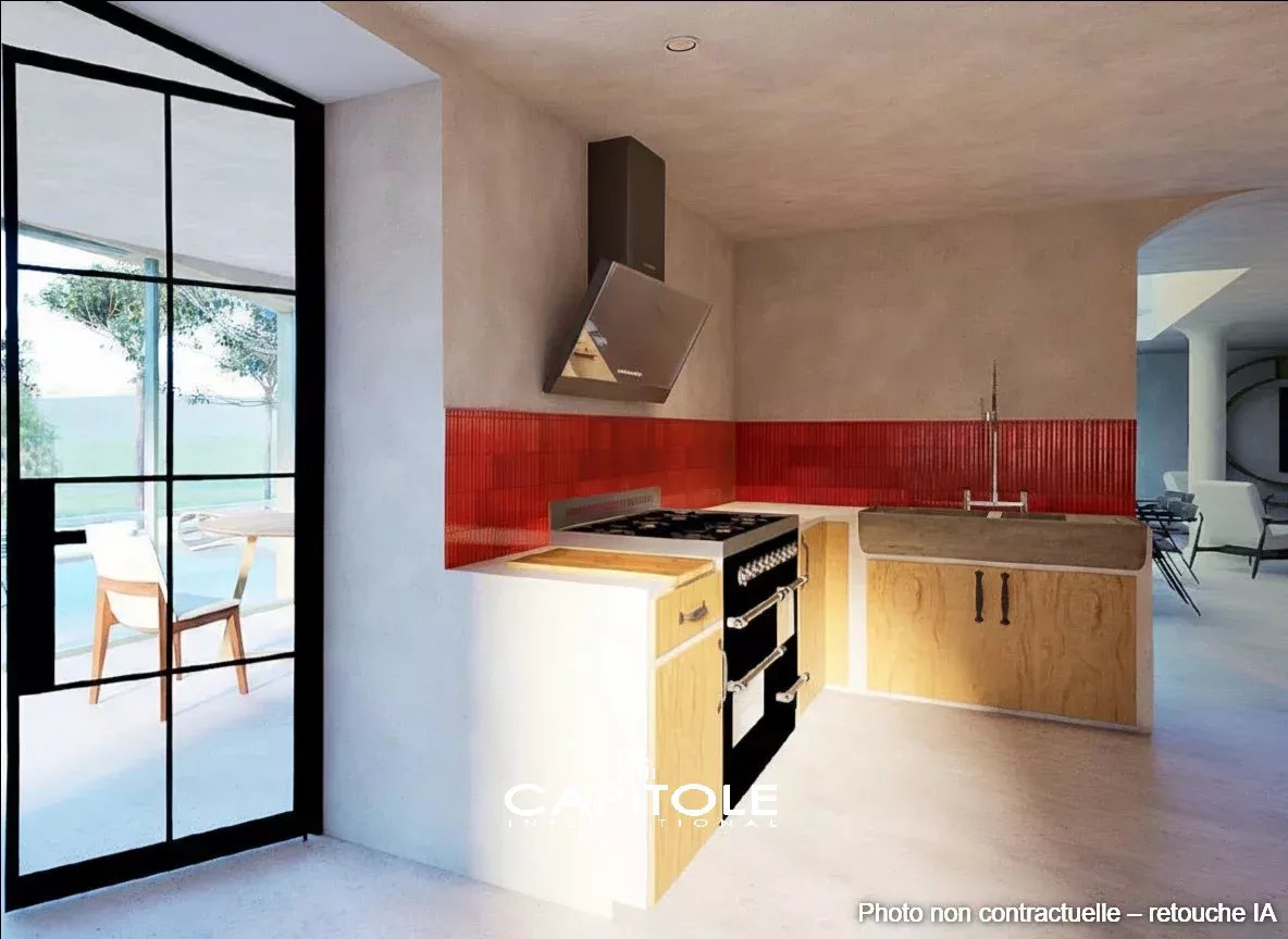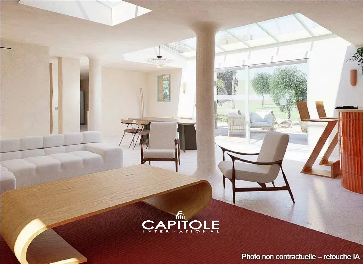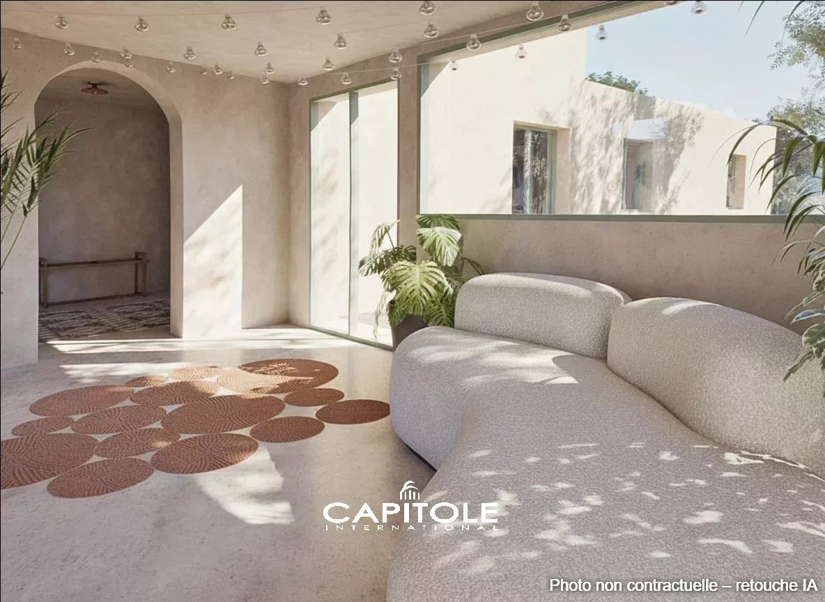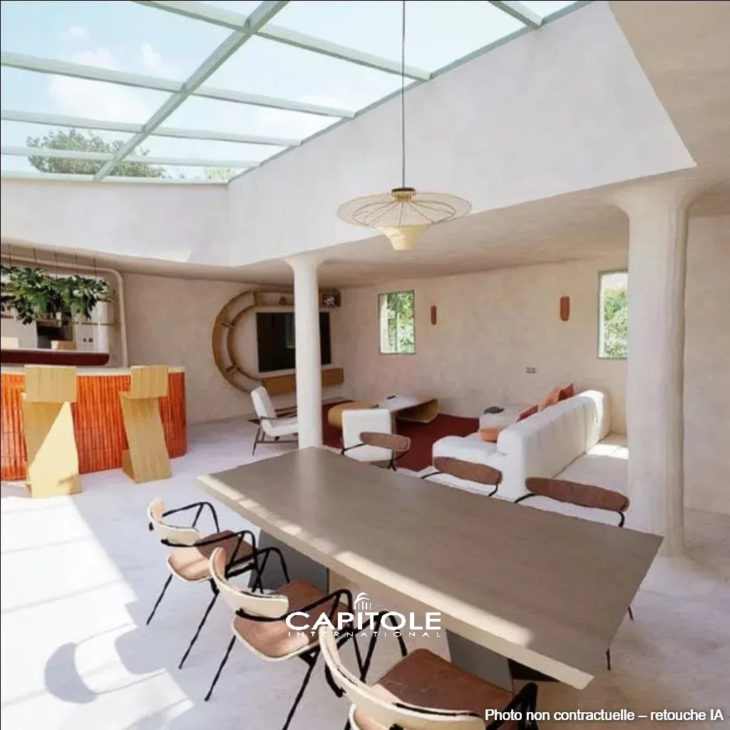 L’architecture contemporaine met en scène la lumière naturelle et les lignes épurées. Les espaces de réception, aux volumes généreux, s’organisent autour d’un salon spectaculaire sublimé par une verrière zénithale, créant une continuité harmonieuse avec la salle à manger. La cuisine, conçue comme un espace de vie à part entière, conjugue équipements professionnels, matériaux nobles et finitions haut de gamme, répondant aux exigences d’une clientèle avertie.