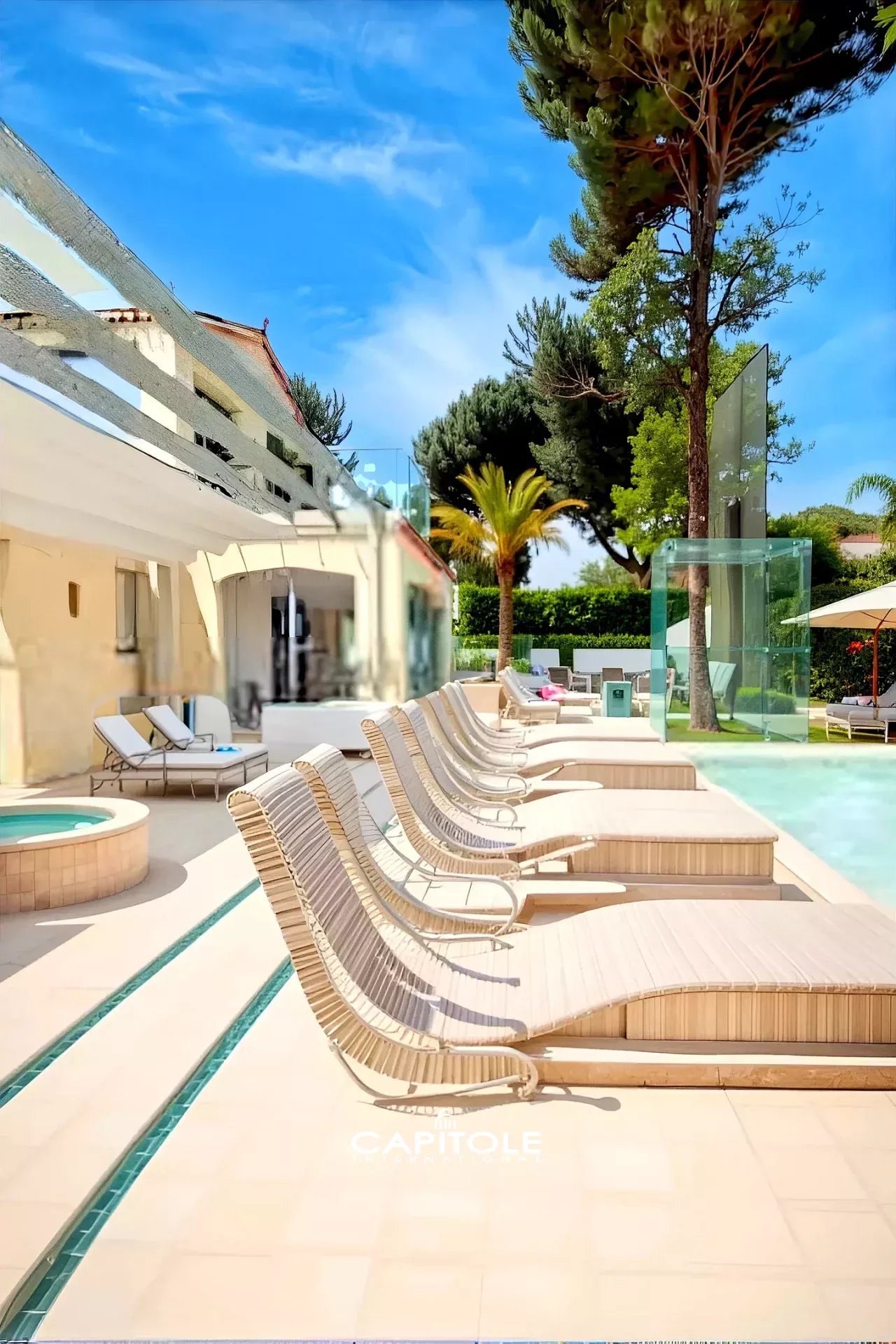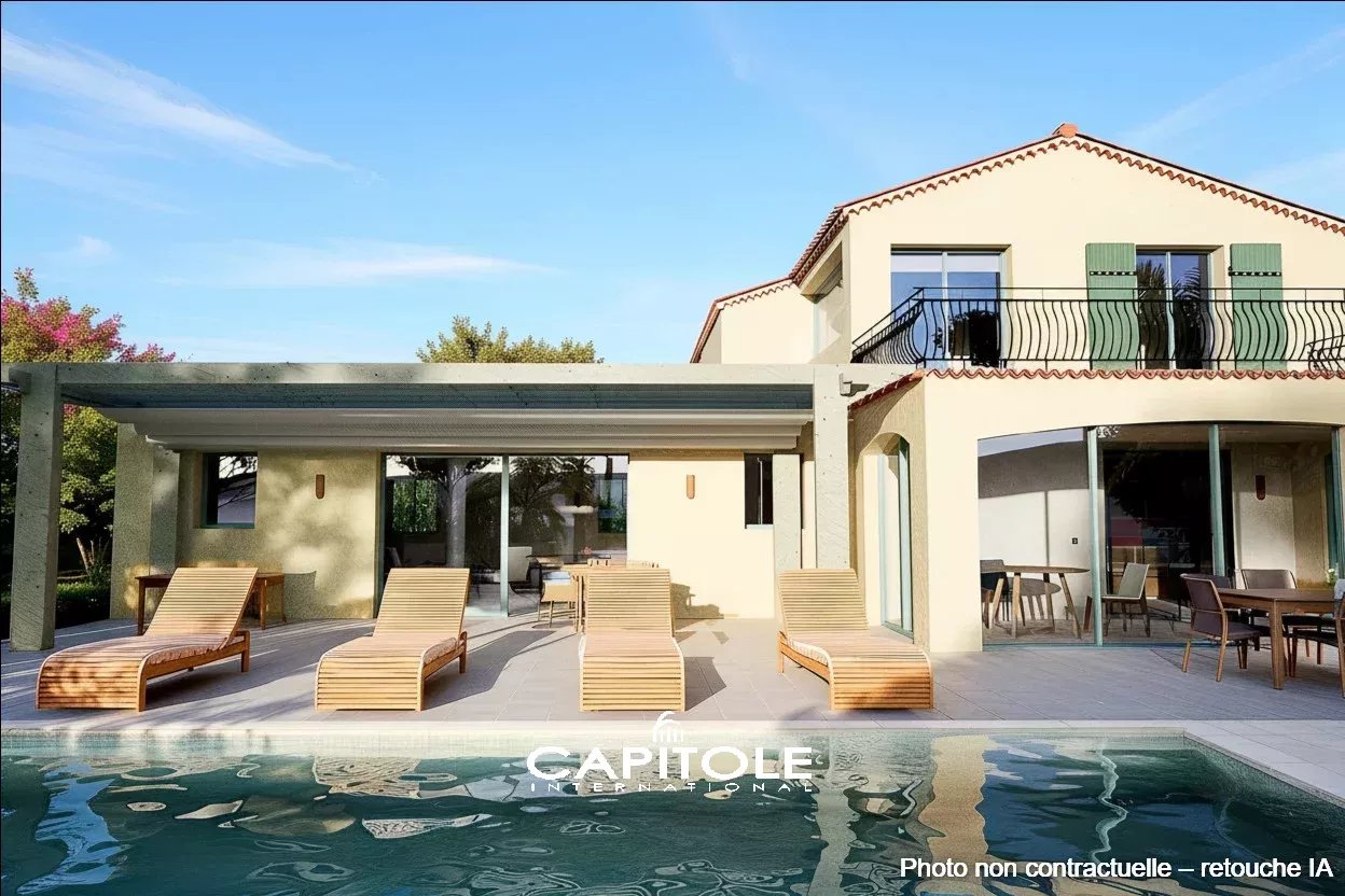 Les extérieurs invitent à la détente et à la convivialité. Une vaste terrasse de 80 m² en béton ciré borde une piscine chauffée de type couloir de nage, parfaitement intégrée au jardin méditerranéen. Le cadre garantit une intimité absolue, complétée par un stationnement sécurisé pouvant accueillir jusqu’à quatre véhicules.